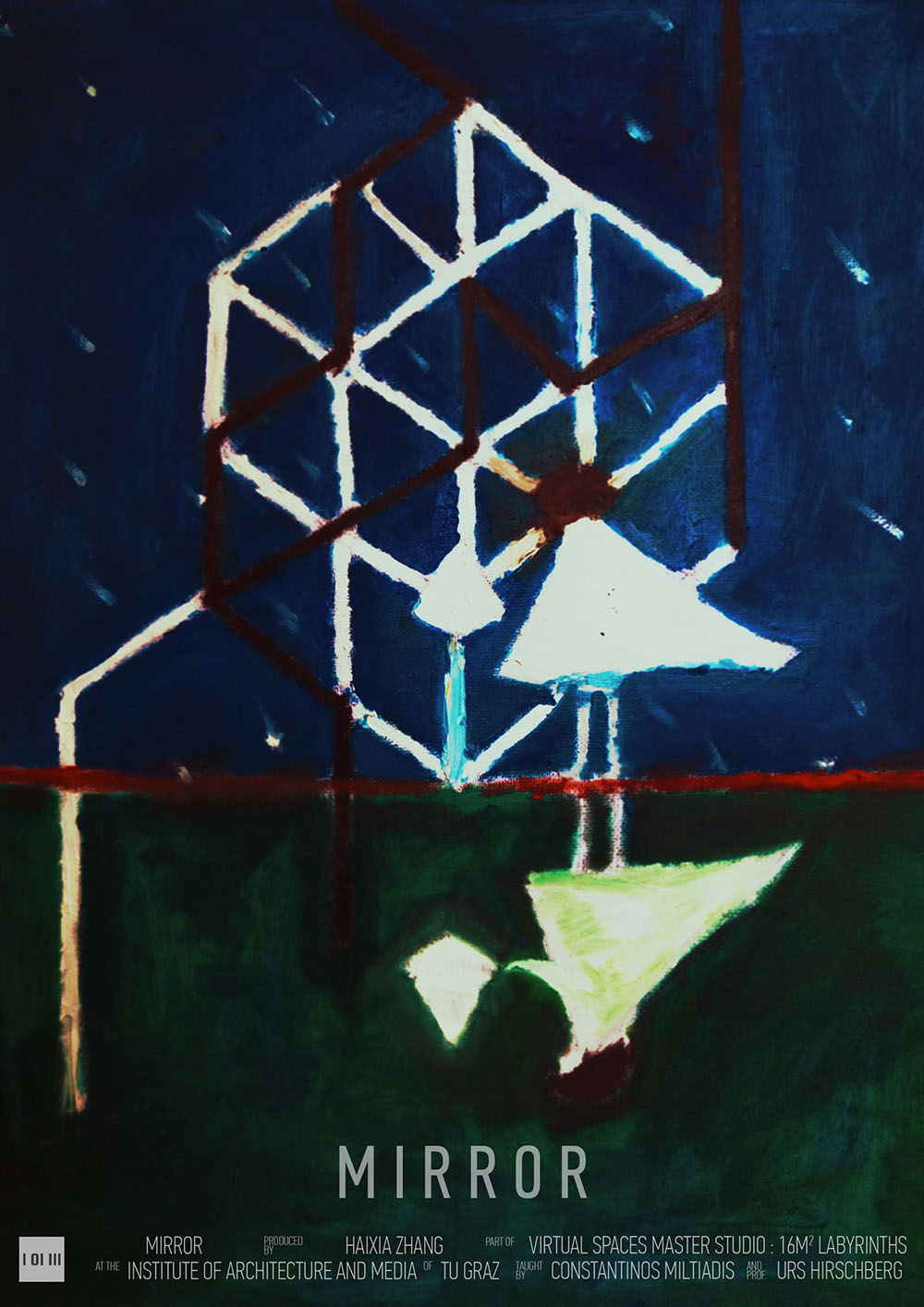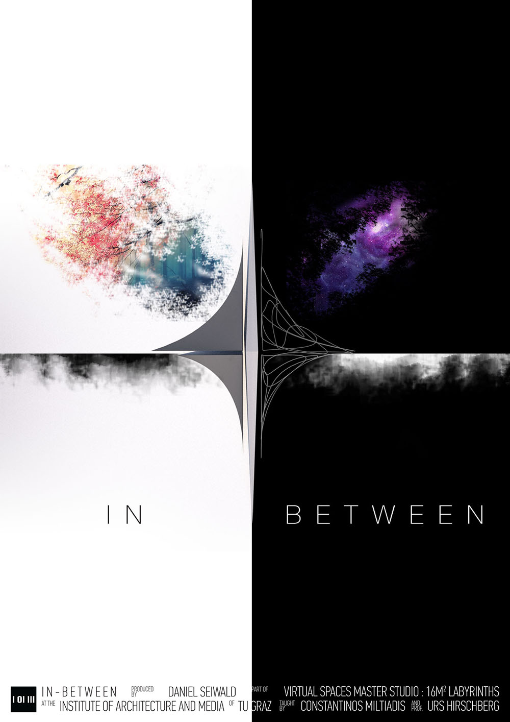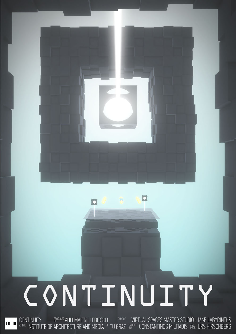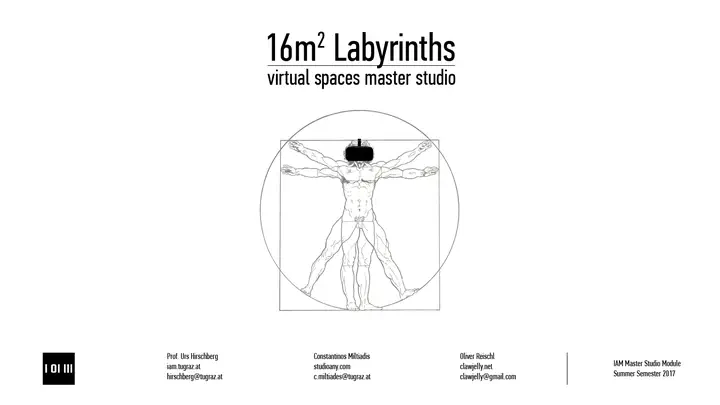 Virtual Spaces Master Studio: 16m2 Labyrinths is an intensive and experimental master design studio module offered by the Institute of Architecture and Media, Faculty of Architecture, TU Graz. As with VSMS 2016, the course developed as final output interactive Virtual Reality applications in the format of videogames, focusing on perceptible and immaterial spatial concepts and experiences. The 2017 VSMS is titled “16m2 Labyrinths” given the physical space constraints (4x4m tracking space) of the HTC Vive VR system.