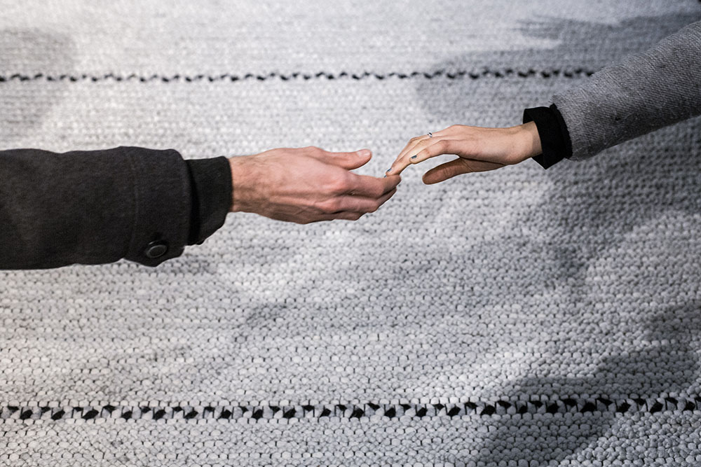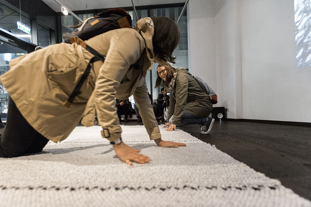 “Sonic Rug is the result of an artistic approach to smart textiles. The project is exploring the possibilities of connecting soft material to the digital space, manifesting the results within an interactive installation, that creates sounds by touch. […] In this Hackathon data from the touch-sensitive installation will be open to be translated into different media.”1