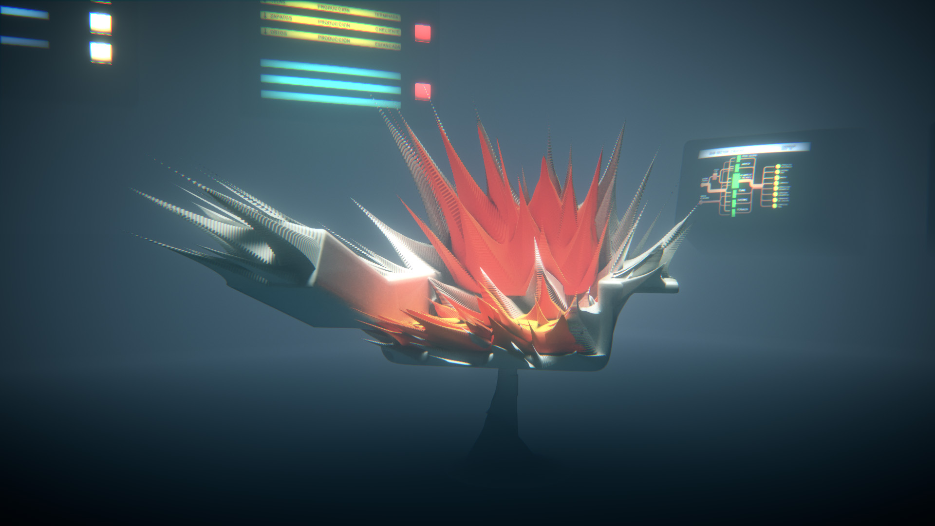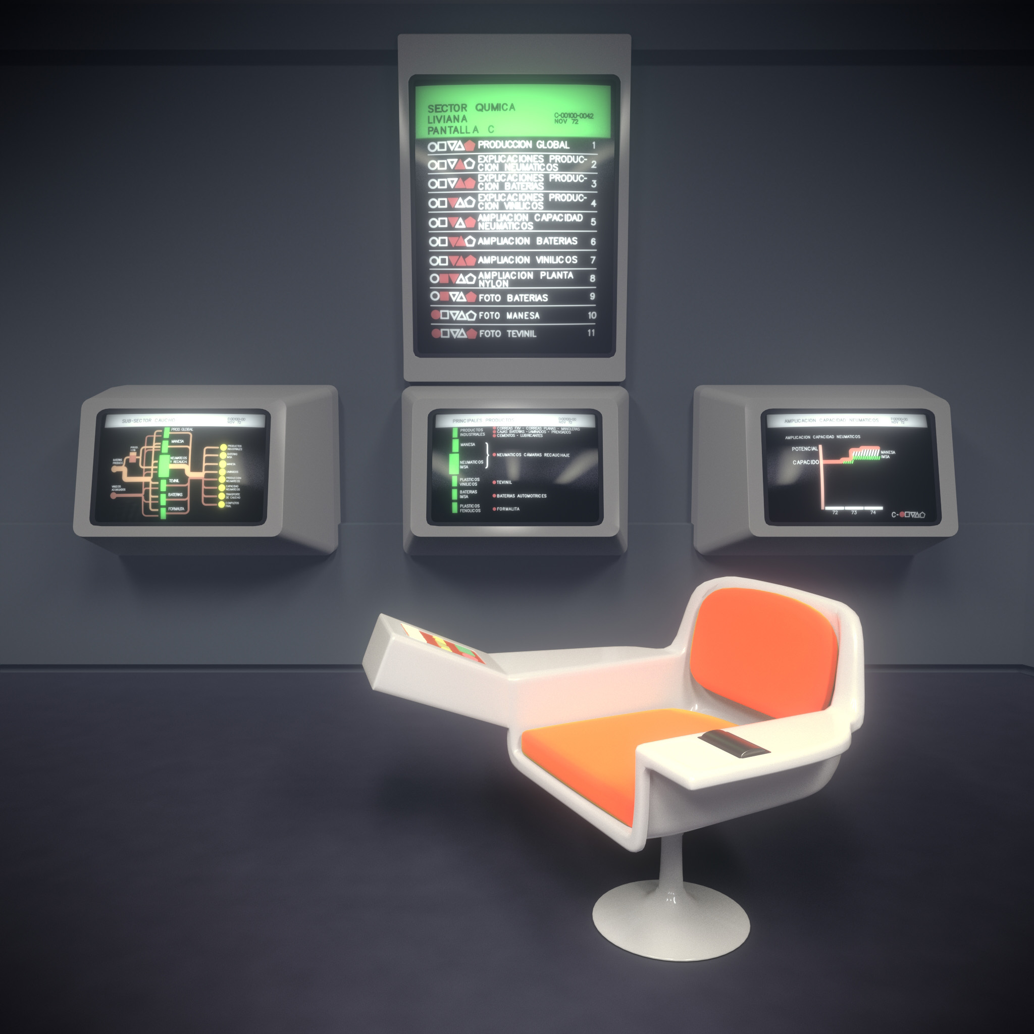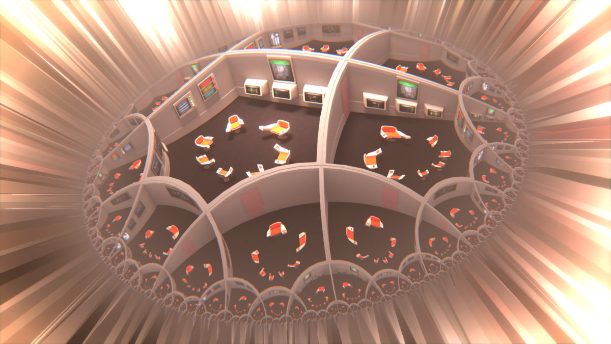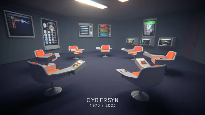 Project Cybersyn was an experiment in instituting a socialist networked economy embraced by the short-lived Salvador Allende government of Chile (1970 – 1973) and developed together with the British cybernetician Stafford Beer. For the past decade, Project Cybersyn has been a recurrent reference – a best practice from the past – in discussions around the repurposing of hegemonic technological infrastructures and their redirection towards more equitable economic and social practices. The iconic image of Project Cybersyn’s control room – with its sci-fi appearance – represents a technical and aesthetic object that alludes to negotiation, democratic decision making, and stability. The allure of this image is the starting point for the video which proposes that desires for post-scarcity and postcapitalist economics must grapple with the shifts in the political, economic, and technological conditions of possibility that have transpired since Project Cybersyn. To this end the control room image itself becomes a platform for alien mutations, philosophical speculations, and social commitments. What would it take to reimagine the artefactual Cybersyn for our hyper-financialized day and age? For this work, curator and researcher Bassam El Baroni and transdisciplinary architect Constantinos Miltiadis collaborated with multidisciplinary artist and animator Georgios Cherouvim, and composer and sound artist Gerriet K. Sharma to bring this question to life.